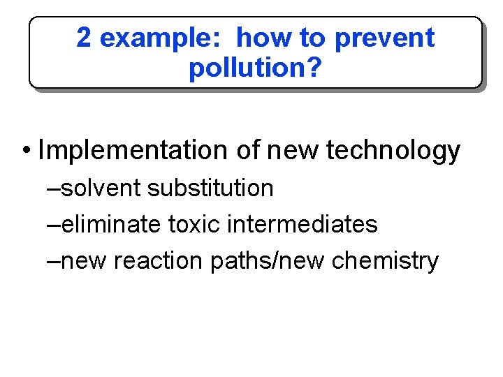 2 example: how to prevent pollution? • Implementation of new technology –solvent substitution –eliminate toxic intermediates –new reaction paths/new chemistry