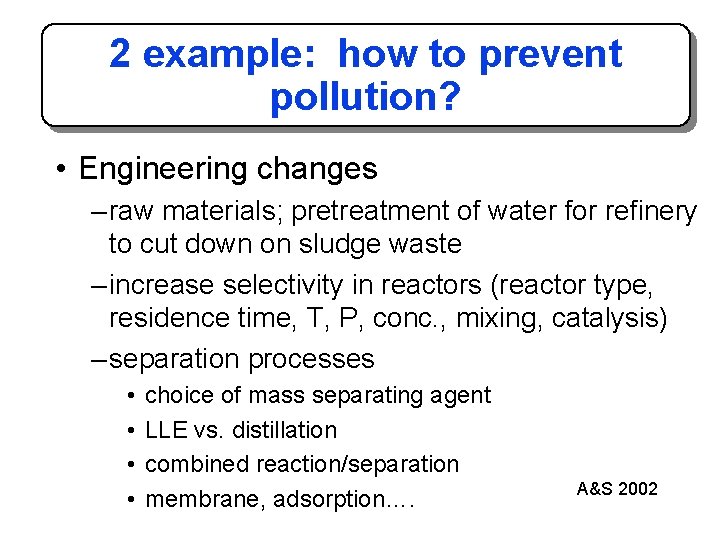 2 example: how to prevent pollution? • Engineering changes – raw materials; pretreatment of water for refinery to cut down on sludge waste – increase selectivity in reactors (reactor type, residence time, T, P, conc. , mixing, catalysis) – separation processes • • choice of mass separating agent LLE vs. distillation combined reaction/separation membrane, adsorption…. A&S 2002