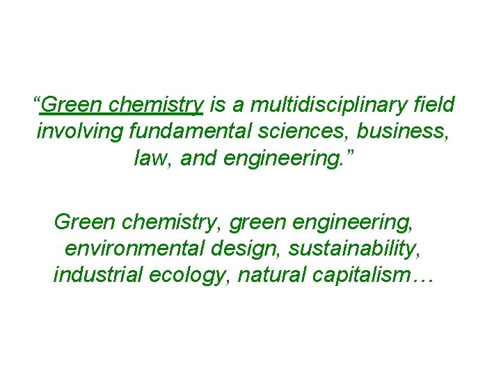 “Green chemistry is a multidisciplinary field involving fundamental sciences, business, law, and engineering. ” Green chemistry, green engineering, environmental design, sustainability, industrial ecology, natural capitalism…