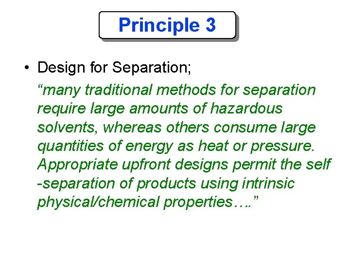 Principle 3 • Design for Separation; “many traditional methods for separation require large amounts of hazardous solvents, whereas others consume large quantities of energy as heat or pressure. Appropriate upfront designs permit the self -separation of products using intrinsic physical/chemical properties…. ”