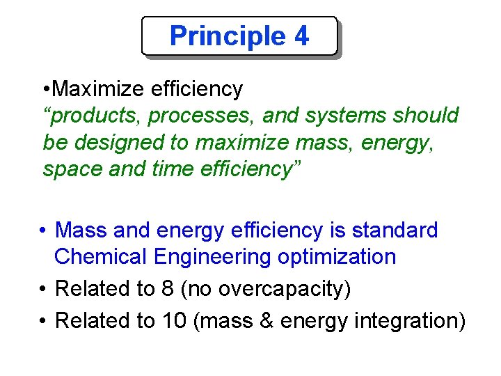 Principle 4 • Maximize efficiency “products, processes, and systems should be designed to maximize mass, energy, space and time efficiency” • Mass and energy efficiency is standard Chemical Engineering optimization • Related to 8 (no overcapacity) • Related to 10 (mass & energy integration)