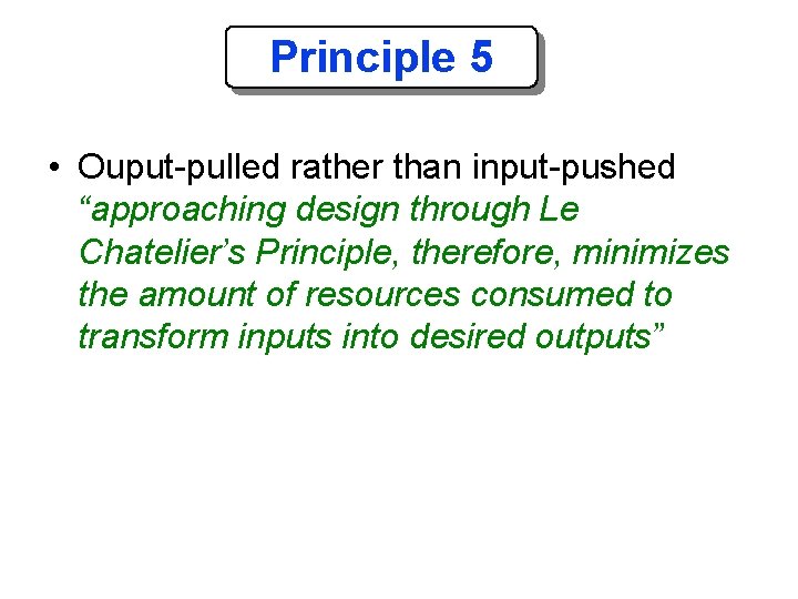 Principle 5 • Ouput-pulled rather than input-pushed “approaching design through Le Chatelier’s Principle, therefore, minimizes the amount of resources consumed to transform inputs into desired outputs”