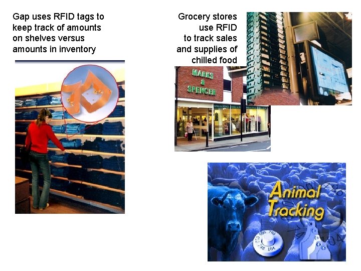 Gap uses RFID tags to keep track of amounts on shelves versus amounts in inventory Grocery stores use RFID to track sales and supplies of chilled food