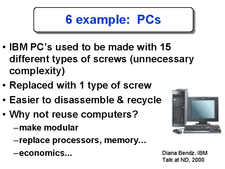 6 example: PCs • IBM PC’s used to be made with 15 different types of screws (unnecessary complexity) • Replaced with 1 type of screw • Easier to disassemble & recycle • Why not reuse computers? – make modular – replace processors, memory… – economics. . . Diana Bendz, IBM Talk at ND, 2000