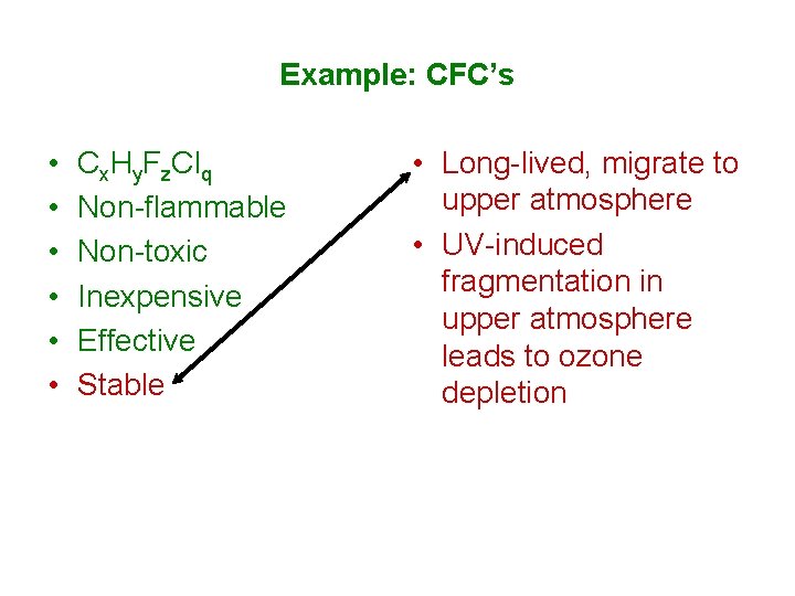 Example: CFC’s • • • Cx. Hy. Fz. Clq Non-flammable Non-toxic Inexpensive Effective Stable • Long-lived, migrate to upper atmosphere • UV-induced fragmentation in upper atmosphere leads to ozone depletion