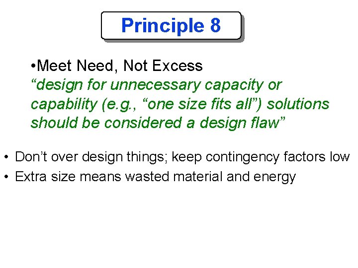 Principle 8 • Meet Need, Not Excess “design for unnecessary capacity or capability (e. g. , “one size fits all”) solutions should be considered a design flaw” • Don’t over design things; keep contingency factors low • Extra size means wasted material and energy