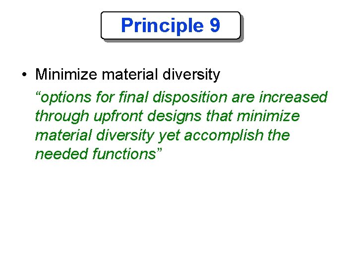 Principle 9 • Minimize material diversity “options for final disposition are increased through upfront designs that minimize material diversity yet accomplish the needed functions”