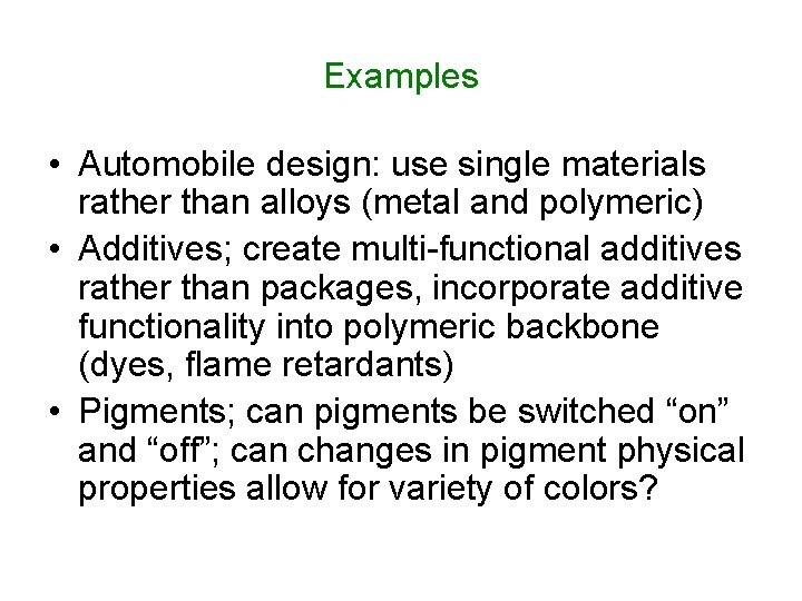 Examples • Automobile design: use single materials rather than alloys (metal and polymeric) • Additives; create multi-functional additives rather than packages, incorporate additive functionality into polymeric backbone (dyes, flame retardants) • Pigments; can pigments be switched “on” and “off”; can changes in pigment physical properties allow for variety of colors?