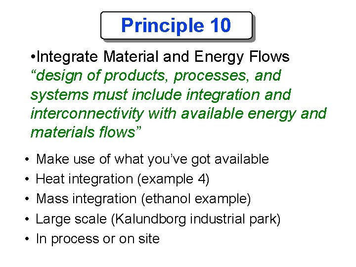 Principle 10 • Integrate Material and Energy Flows “design of products, processes, and systems must include integration and interconnectivity with available energy and materials flows” • • • Make use of what you’ve got available Heat integration (example 4) Mass integration (ethanol example) Large scale (Kalundborg industrial park) In process or on site