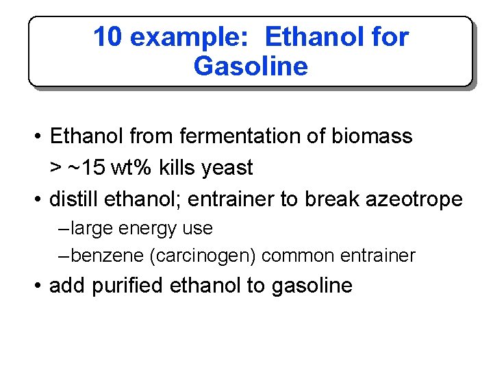 10 example: Ethanol for Gasoline • Ethanol from fermentation of biomass > ~15 wt% kills yeast • distill ethanol; entrainer to break azeotrope – large energy use – benzene (carcinogen) common entrainer • add purified ethanol to gasoline