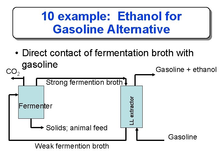 10 example: Ethanol for Gasoline Alternative • Direct contact of fermentation broth with gasoline Gasoline + ethanol CO 2 Fermenter Solids; animal feed LL extractor Strong fermention broth Gasoline Weak fermention broth