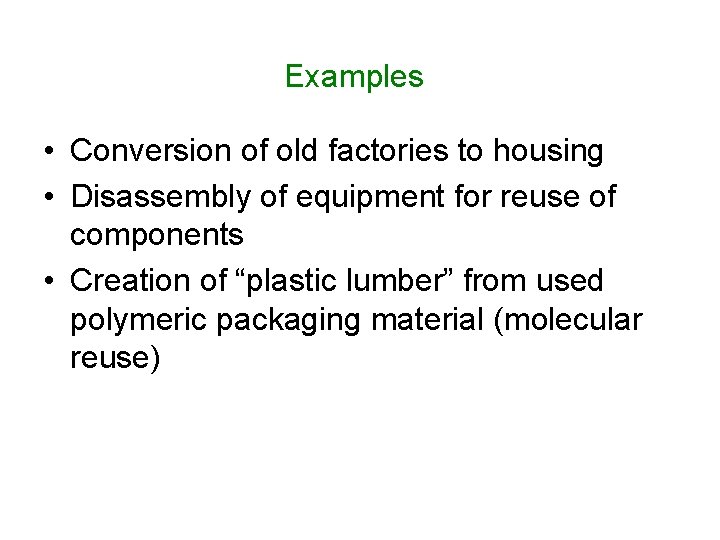 Examples • Conversion of old factories to housing • Disassembly of equipment for reuse of components • Creation of “plastic lumber” from used polymeric packaging material (molecular reuse)