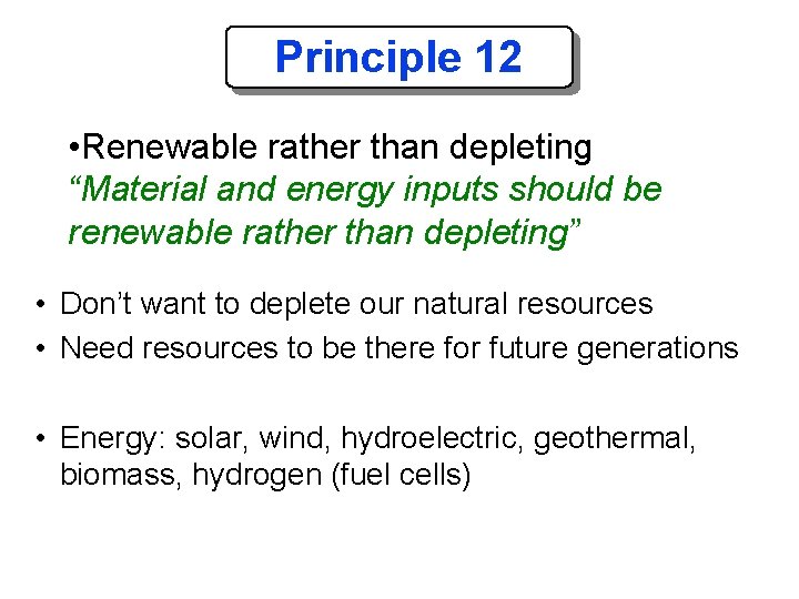 Principle 12 • Renewable rather than depleting “Material and energy inputs should be renewable rather than depleting” • Don’t want to deplete our natural resources • Need resources to be there for future generations • Energy: solar, wind, hydroelectric, geothermal, biomass, hydrogen (fuel cells)