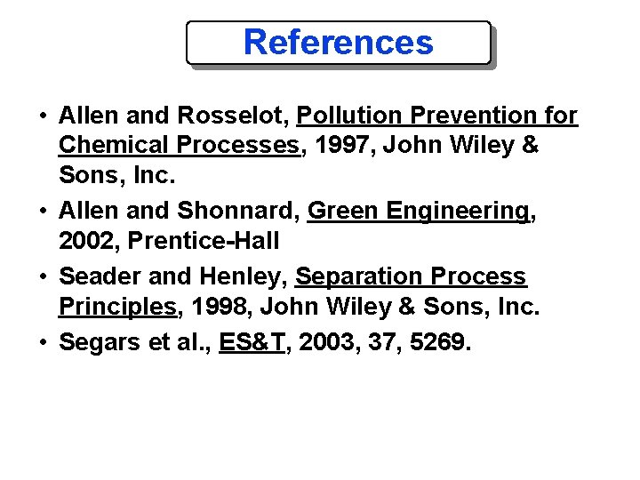 References • Allen and Rosselot, Pollution Prevention for Chemical Processes, 1997, John Wiley & Sons, Inc. • Allen and Shonnard, Green Engineering, 2002, Prentice-Hall • Seader and Henley, Separation Process Principles, 1998, John Wiley & Sons, Inc. • Segars et al. , ES&T, 2003, 37, 5269.