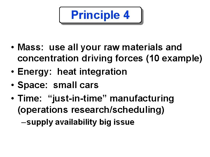 Principle 4 • Mass: use all your raw materials and concentration driving forces (10 example) • Energy: heat integration • Space: small cars • Time: “just-in-time” manufacturing (operations research/scheduling) – supply availability big issue