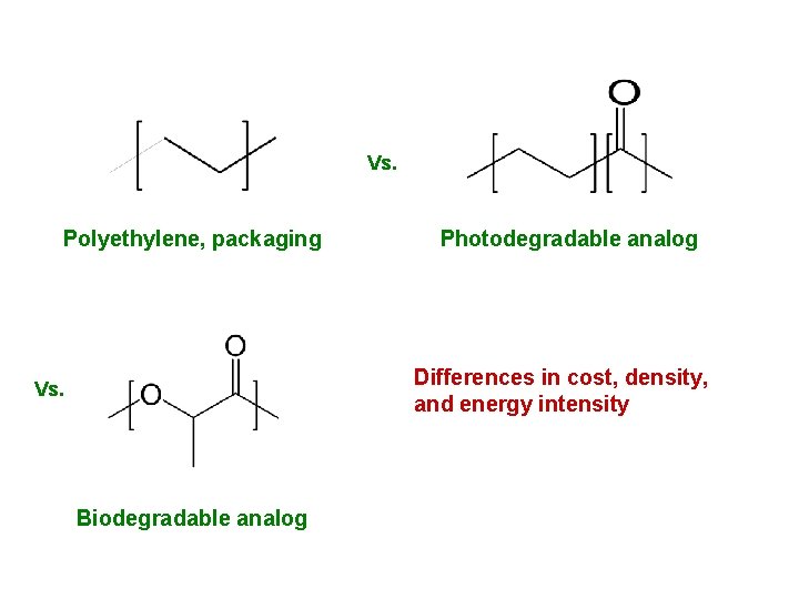 Vs. Polyethylene, packaging Photodegradable analog Differences in cost, density, and energy intensity Vs. Biodegradable analog