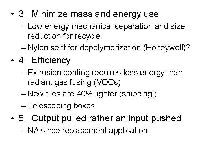 • 3: Minimize mass and energy use – Low energy mechanical separation and size reduction for recycle – Nylon sent for depolymerization (Honeywell)? • 4: Efficiency – Extrusion coating requires less energy than radiant gas fusing (VOCs) – New tiles are 40% lighter (shipping!) – Telescoping boxes • 5: Output pulled rather an input pushed – NA since replacement application