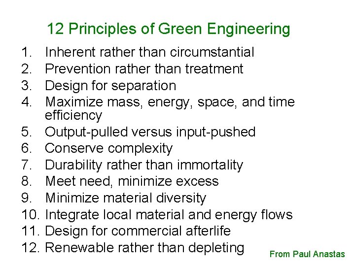 12 Principles of Green Engineering 1. 2. 3. 4. 5. 6. 7. 8. 9. 10. 11. 12. Inherent rather than circumstantial Prevention rather than treatment Design for separation Maximize mass, energy, space, and time efficiency Output-pulled versus input-pushed Conserve complexity Durability rather than immortality Meet need, minimize excess Minimize material diversity Integrate local material and energy flows Design for commercial afterlife Renewable rather than depleting From Paul Anastas