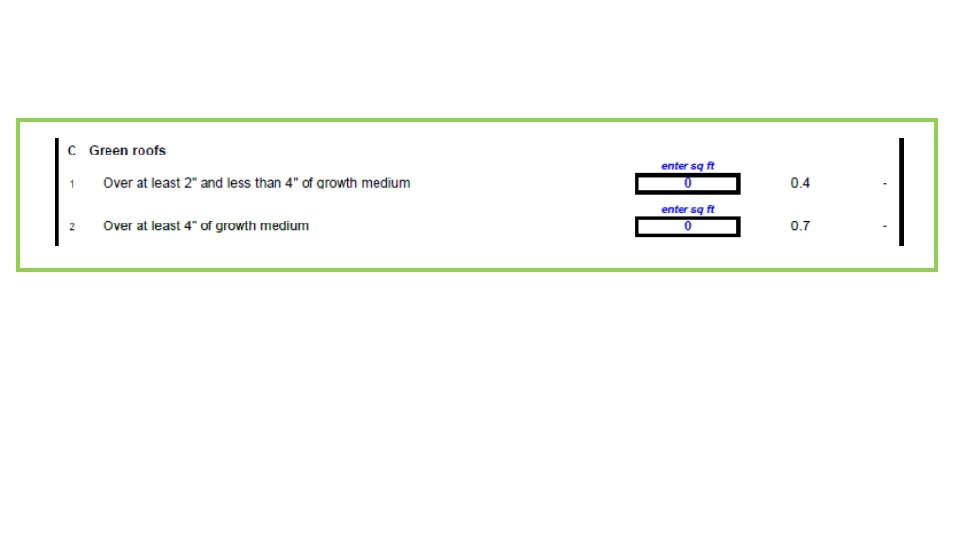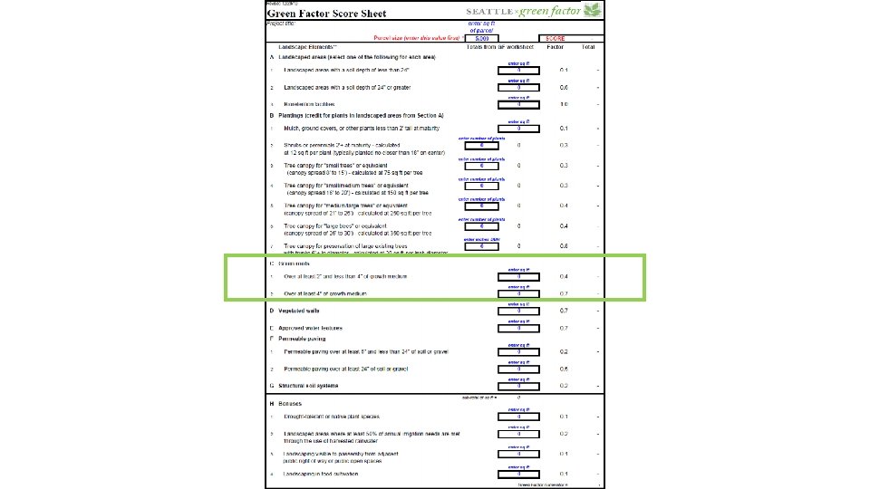 Seattle Green Factor Minimum scores of 0. 30 0. 50 0. 60 Points given for (Landscape element) x (square feet) Intensive green roof defined as 4” or greater La. Clergue, Dave (2013) Seattle Green Factor: Improving Livability and Ecological Function through Landscaping Standard. s