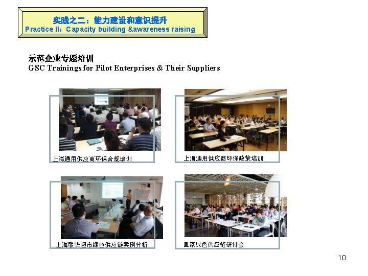 企业试点主要成效 Achievement of Enterprises Demonstration • 与企业共同编制了绿色供应链规范性文件 GSC related specification for pilot enterprises have been developed - 宜家供应链节水管理指南 IKEA Water Supply Chain Water Saving Handbook - 上海通用汽车绿色供应链管理规范性指南 SGM GSC Normative Handbook - 上海商贸企业绿色门店标准框架 Green Store Criteria Framework • 试点供应商取得了一定的环境效益 Environmental benefits have been achieved - 宜家 1家供应商:节水 40%,COD减排 23. 9吨/年,污泥量减排 300吨/年(估算) one supplier for IKEA: 40% of fresh water saved, COD reduced by 23. 9 t/y, sludge reduced by 300 t/y (estimated) - 上海通用项目:节水 18万吨/年,节电 1053万度/年,CO 2减排 3. 3万吨/年(估算) SGM: 180000 tons of water saved annually, 10. 5 mil. KWh electricity saved per year, and 33000 tons of CO 2 reduced per year (estimated) - 联华超市1家门店改造:节电 30万度/年,CO 2减排 765吨/年 One supermarket at Lianhua: 0. 3 mil. KWh electricity saved and 765 tons of CO 2 reduced per year • 帮助企业逐步建立或完善绿色供应链管理制度 GSC related system for pilot enterprises have been established gradually or improved 9