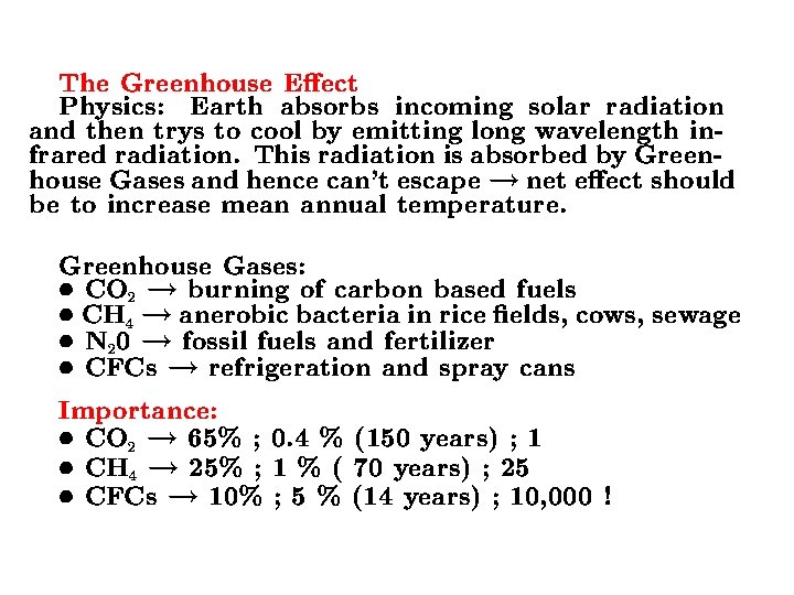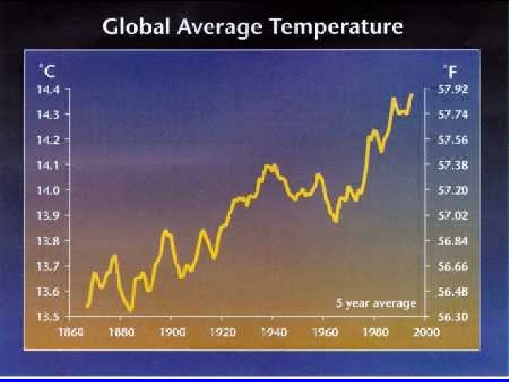 Potential Outcome ä Rising Temperature ä 1. 8 - 6. 8 o. F in the next century ä if increase at current rates - 15 -20 o. F ä Sea Level Rise ä 6 - 37 inches in the next century ä as high as 80 inches ä 1 yd will be enough to flood 1% of Egypt, 6% Netherlands, 17. 5% Bangladesh, and many islands