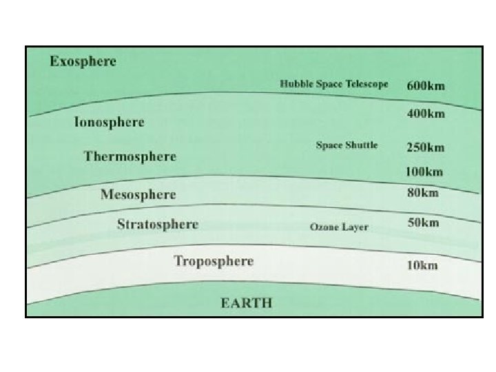 Greenhouse effect ä Greenhouse effect is essential for life on Earth ä Without this temperatures would be much colder about 0 o. F instead of 57 o. F ä Layers of the Earth’s Atmosphere ä Goldilocks Theory Venus too close, Mars too far, Earth just right ä Liquid water - hydrated minerals, plate tectonics, recycling of gases from the earth - greenhouse effect ä