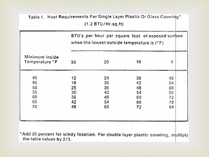 Locate Thermostat at plant height w/ shade over top to avoid false readings Vented Heaters: Down drafts caused by chimney not high enough to clear ridge of g. h. (at least 2’) open doors & vents can cause draft HEATING SAFETY MARGIN: Rule of thumb: for est. heat loss 1. 2 BTU per hour for each degree of temp differential per sqft of exposed surface