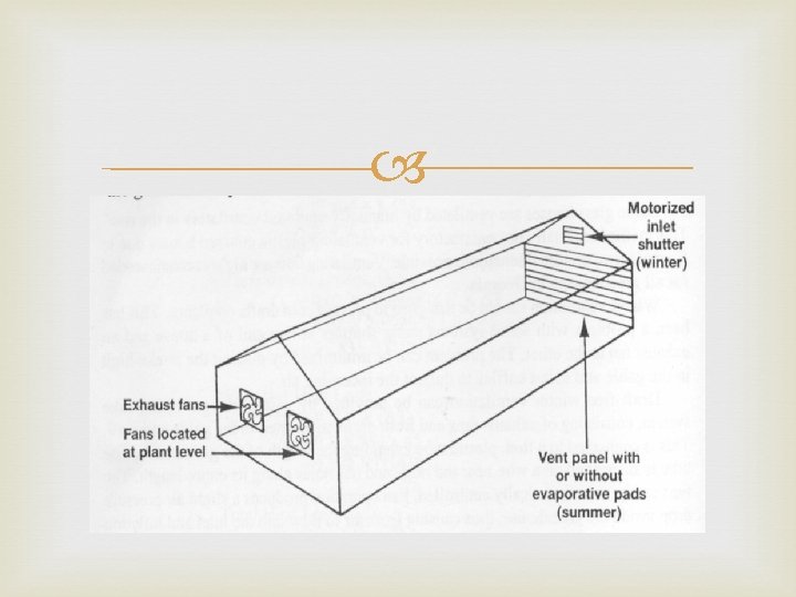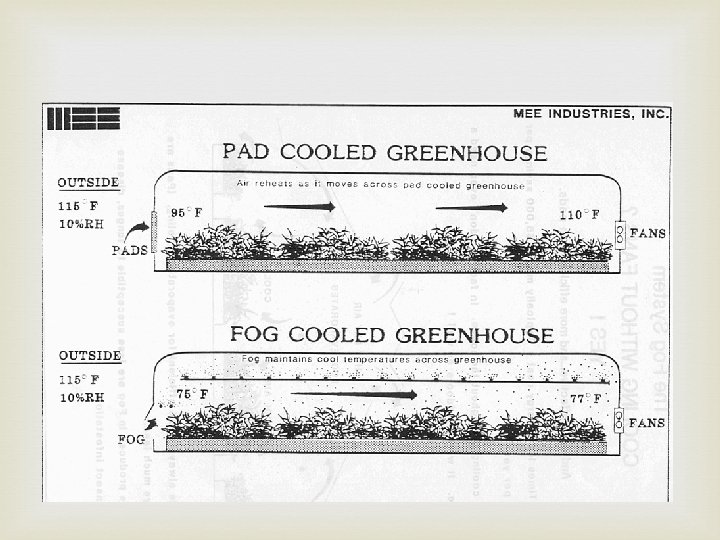 Describe the internal structures and equipment of a greenhouse cont. Cooling Fan and Pad Exhaust fan draws air through moist cellulose pad, air is cooled through evaporation, for dry air conditions Fog Evaporative Fog is generated within the greenhouse, heat is absorbed by the water droplets and evaporated, cooling the greenhouse environment, use in propagation houses.