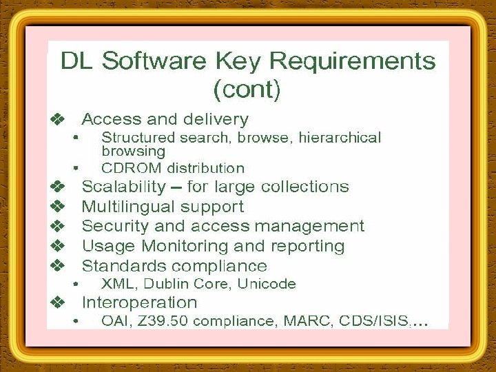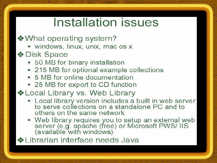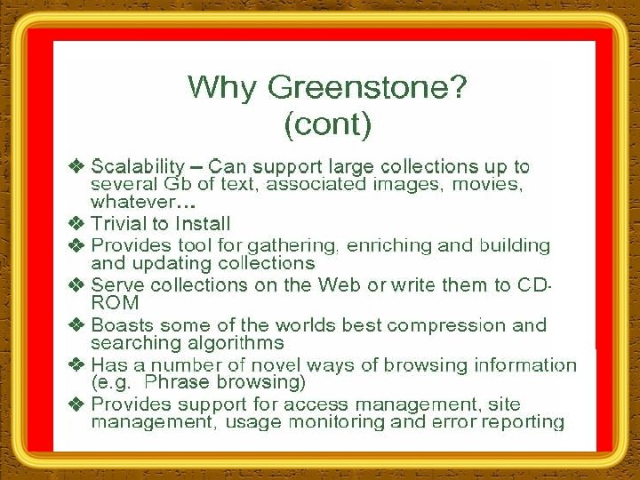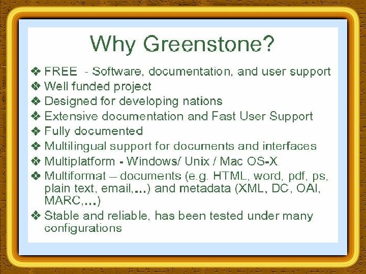 Features of Greenstone Software • Access through Web browser • Windows or Unix • Searching • Browsing • Easy to maintain • Various metadata • Plug-ins for new document types • Multiple languages • Text, pictures, audio, video • Open Source Software • Hierarchical phrase and key-phrase indexes • Multi-gigabyte • Compression • Password Protection • User logs • Administrative functions • Updates dynamically without bringing system down • Publish to CD-ROM • Uniform presentation across different computers