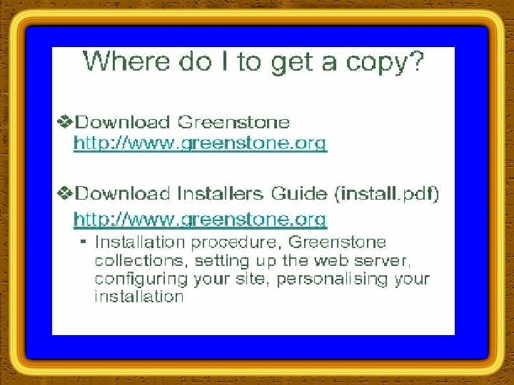 Distribution Greenstone facts v Open source: Gnu GPL v Distributed via Source. Forge since: Nov 2000 v Average downloads: 5000/month since then v Humanitarian CD-ROMs produced: 30 -35 v Distribution for each one: 5000/year v Languages for interface: 38 v Languages for full software + manuals: 4 v Countries represented on email lists: 60 v UNESCO training courses in: Bangalore, Almaty, Dakar, Suva, … v UNESCO, Paris (“Information for All” programme) UN Agencies v FAO, Rome (Info Management Resource Kit) v UNU, Japan (CD-ROM collections of UNU material) International Technical centers v University of Waikato, New Zealand v Indian Institute of Sciences, Bangalore v University College, London v University of Cape Town, South Africa v University of Lethbridge, Canada