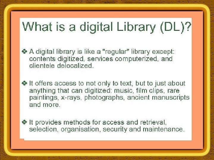 What is a Digital Library? • A digital library is an organized collection of information – A focused collection of digital objects – Methods for finding, access and retrieval – Methods for selection, organization, and maintenance of the collection – Methods for preservation