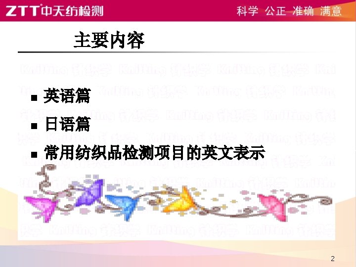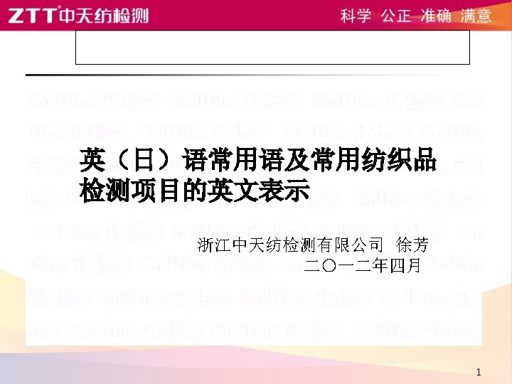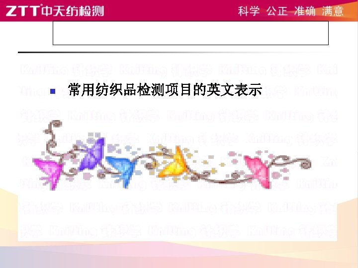 Composition and analytical tests Fiber composition 纤维含量 a. Qualitative analysis 定性分析 b. Quantitative analysis 定量分析 Formaldehyde content甲醛含量 p. H value p. H值 Odour 异味 AZO dye analysis(by GC MS)偶氮类燃料分析 Extractable metal content 重金属含量