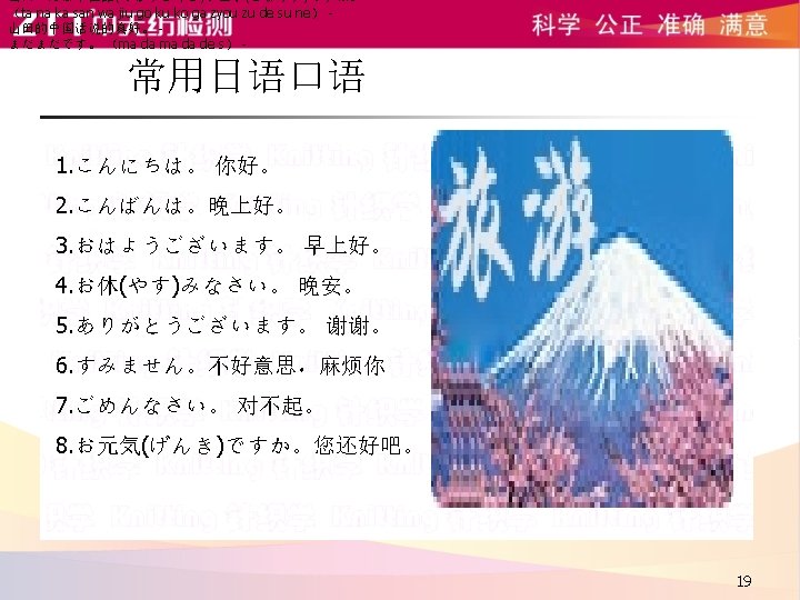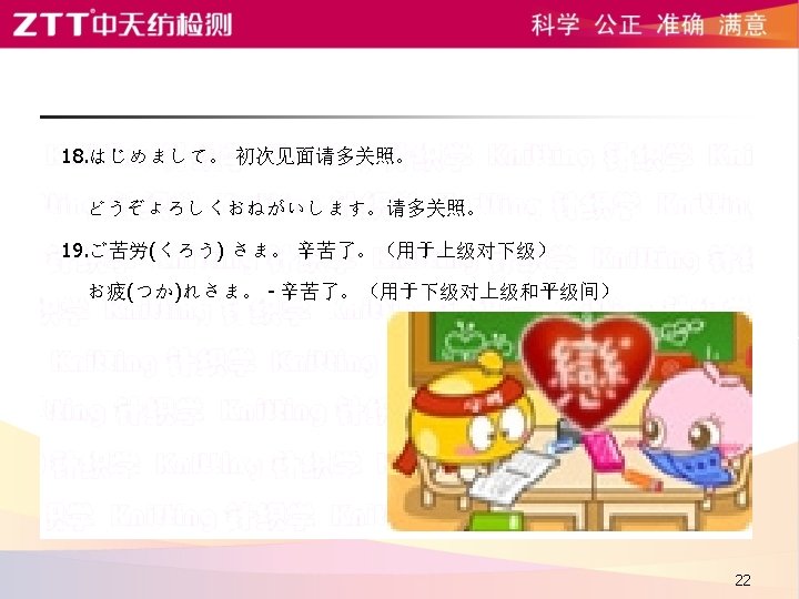 问候 greeting It is very important to greet people. Nice greetings will make us feel warm and friendly. We like to be greeted by people nicely. So we should learn to greet people nicely in English. In any countries, proper greetings are good manners. greetings bring people close, and greetings make people happy. 与人问候是非常重要的。优美的问候话语让 我们感到温馨和友好。我们喜欢别人跟我们 友好地问候。 因此我们就应该学会跟别人 用英语友好地问好。在任何一个国家,得体 的问候是一个人有修养的表现。 问候可以 拉近人与人之间的距离;问候能使人们心情 愉快。