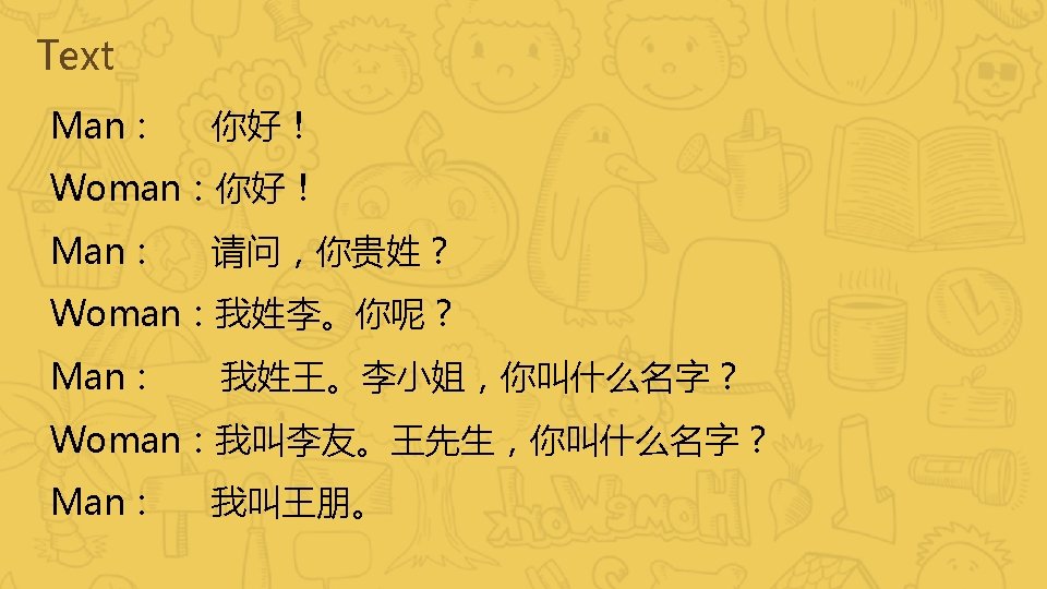 Question You can discuss it with your group members 1、What did the man say first to the woman? 2、What is the woman`s family name? 3、What is the man`s full name? Please read the text to answer the following questions