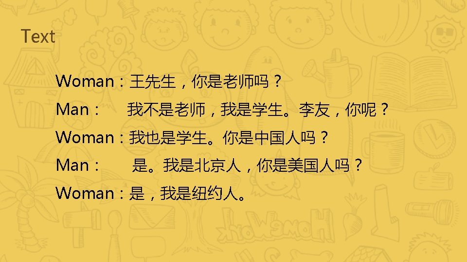 Questions Ending with 吗(ma) Question: 你是老师吗? nǐ shì lǎo shī ma ? Are you a teacher? Affirmative answer:我是老师。 wǒ shì lǎo shī 。 I am a teacher. Negative answer: 我不是老师。 wǒ bú shì lǎo shī 。 I am not a teacher.