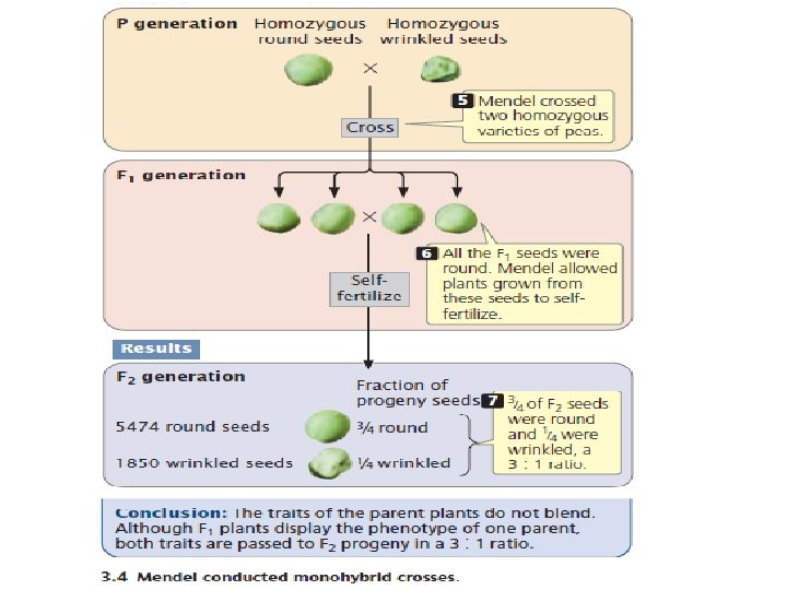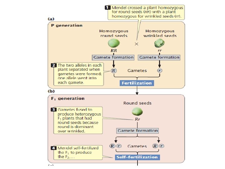 § Mendel began by studying monohybrid crosses— those between parents that differed in a single characteristic. § In one experiment, Mendel crossed a pure-breeding (homozygous) pea plant for round seeds with one that was pure-breeding for wrinkled seeds. § This first generation of a cross is the P (parental) generation.
