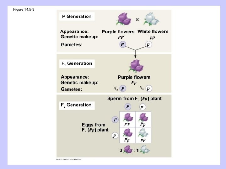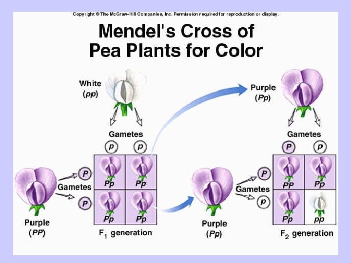 Mendel’s Experiment • Mendel developed a true-breeding parent generation, P generation. • True-breeding purple flowered plants always produce purple flowered offspring. • Mendel crossed purple & white flowered plants. The offspring are called the first filial generation, F 1 generation. They all had purple flowers. • The offspring of the F 1 generation is called the F 2 generation.