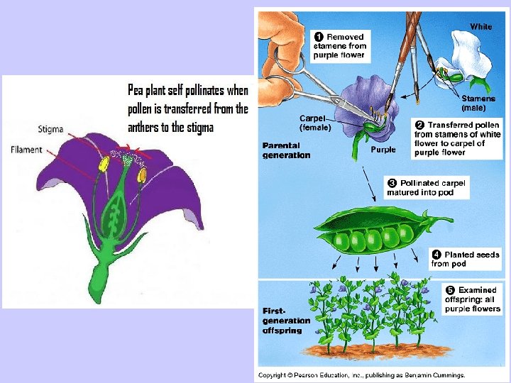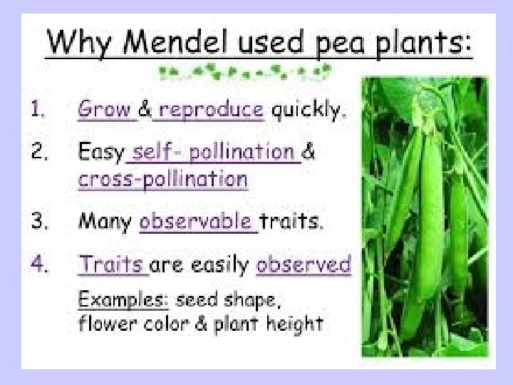 Gregor Mendel: Father of Genetics • Mendel conducted experiments using garden pea plants • Cross pollinated flowers and observed traits in offspring BIO. B. 2. 1. 1 Describe & predict observed patterns of inheritance (i. e. dominant, recessive, codominance, incomplete dominance, sex-linked, polygenic and multiple alleles).