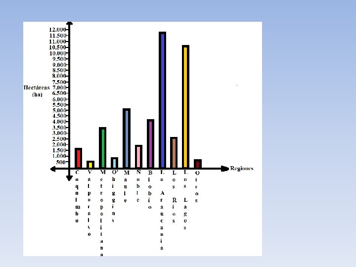 3) Graduemos el eje y • Para esto volvamos a mirar la tabla y determinemos mínimo y máximo de las superficies Mínimo: 513 ha Máximo: 11. 578 ha Por la amplitud de los datos graduaremos en este caso de 500 en 500