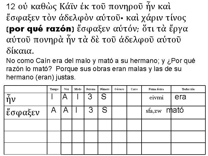 1 Jn 3: 11 -12 11 Ὅτι αὕτη ἐστὶν ἡ ἀγγελία (mensaje) ἣν ἠκούσατε ἀπ᾽ ἀρχῆς (principio), ἵνα ἀγαπῶμεν ἀλλήλους, Porque este es el mensaje que ustedes oyeron (o han oído) del principio: que nos amemos unos a otros. Tiempo Voz Modo P A I ἐστὶν ἠκούσατε A A I ἀγαπῶμεν P A S Persona Número 3 S 2 P 1 P Género Caso Forma léxica Traducción eivmi, es avkou, w oyeron avgapa, w amemos