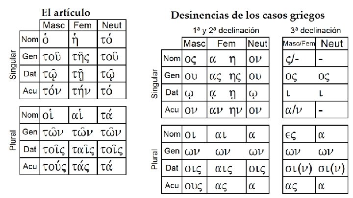 Las desinencias de los sustantivos y artículos femeninos de la 1 a declinación Caso Nominativo Genitivo Dativo Acusativo Vocativo Singular ἡ καρδία τῆς καρδίας τῇ καρδίᾳ τὴν καρδίαν καρδία Plural αἱ τῶν ταῖς τὰς καρδίαι καρδίῶν καρδίαις καρδίαι