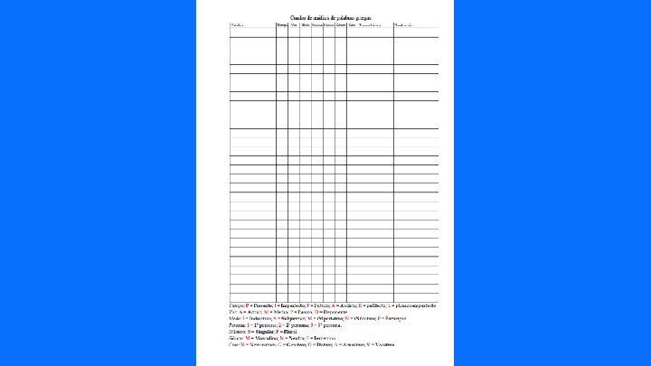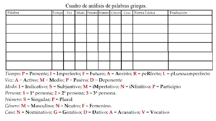 Tiempo a`marti, aj zwai, tw/n avga, pw/n Voz Modo Persona Número S P Género F Caso G A Forma léxica Traducción a`marti, a de pecados P F N zwh, Vidas P F G avga, ph de los amores