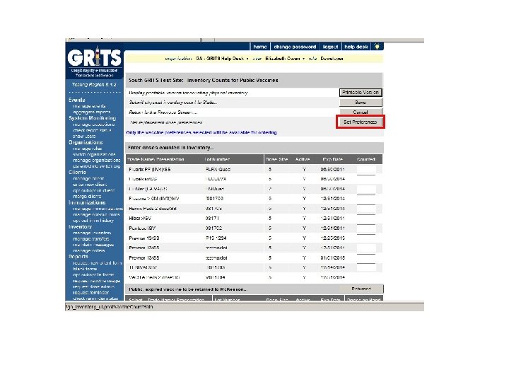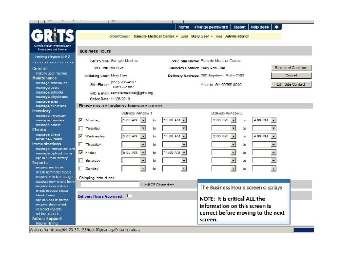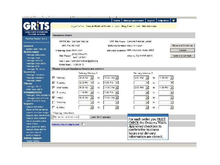 GRITS Reporters Only The Process: 1. 2. 3. 4. 5. 6. 7. 8. 9. 10. 11. 12. 13. Count physical state supplied vaccine stored in your units (refrigerator and freezer) Log into GRITS. On the blue menu panel under the Inventory menu group, click ‘manage inventory’ menu item. The Manage Inventory Screen is displayed. Click ‘Show Inventory” button. Click the ‘Count Inventory’ button and then click the ‘Set Preferences” button. Select your preferences and shipping option. Click the ‘Save button’ Click ‘Cancel’ to return to the ‘Count Inventory’ screen. Enter current inventory counts to generate the Monthly Comprehensive Report. Review the report for errors – doses listed in the Insured/Ineligible column and/or (+), (-) doses listed in Column I – ‘Counted Inventory Differs from Expected By’ Doses Expected On Hand on the Vaccine Accountability Statement. Submit corrections to VFC if needed. Review the Vaccine Accountability Statement Column J for “Doses Presumed Needed” to plan ahead for placing your order using the new manage orders function. Click the ‘Approve’ button to submit the report to VFC. Navigate to the blue menu panel under the Inventory menu group, click, the ‘manage order’ menu item. The manage order screen displays. Follow the prompts to update site information and business hours. As a reminder, delivery window #1 refers to the time period open prior to lunch. Delivery window #2 is the period of time your clinic is open after lunch. If your site does not close for lunch, then enter your open and close times in delivery window #1. Save updated data and click save and continue to proceed to create a vaccine order.