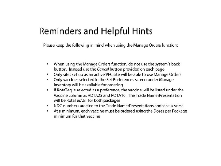 The following slides include information from the manage orders module video as well as notes and step by step instructions to help you complete the mange orders process. You will receive step by step instructions for accepting vaccine transfers in a separate document.