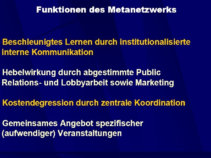 Elemente einer Gründungskultur • Persönliche Orientierung auf Entrepreneurship – – – Lektüre und Studium Praxisbeispiele und Praxiskontakte im Mittelstand Praktika, Plan- und Rollenspiele • Orientierung der Hochschulausbildung auf Selbständigkeit • Praktische Hilfen – Gründerberatung – Gründungshilfen • organisatorisch-kaufmännisch – Businessangels – Netzwerke • Finanziell – Staatlich – venture capital – durch Kooperation