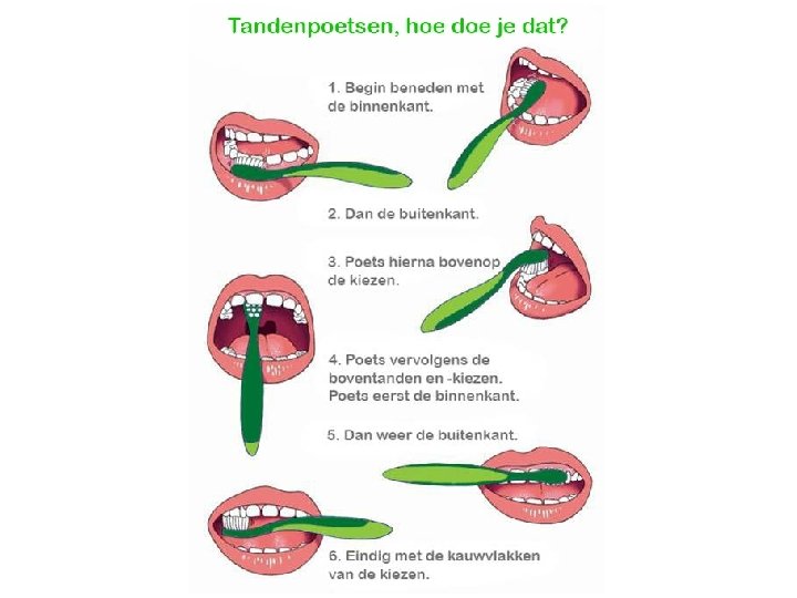 Tips • • Gebruik tandpasta met fluoride (>1100 ppm) • • Poets 2 keer per dag 2 • minuten • Gebruik een zachte kleine tandenborstel. • Poets ook het tandvlees • Max. 7 keer per dag iets eten of drinken • Ga 2 keer per jaar naar een tandarts Let op zure producten Eet alles zo snel mogelijk op Poets de nieuwe kiezen achterin goed mee
