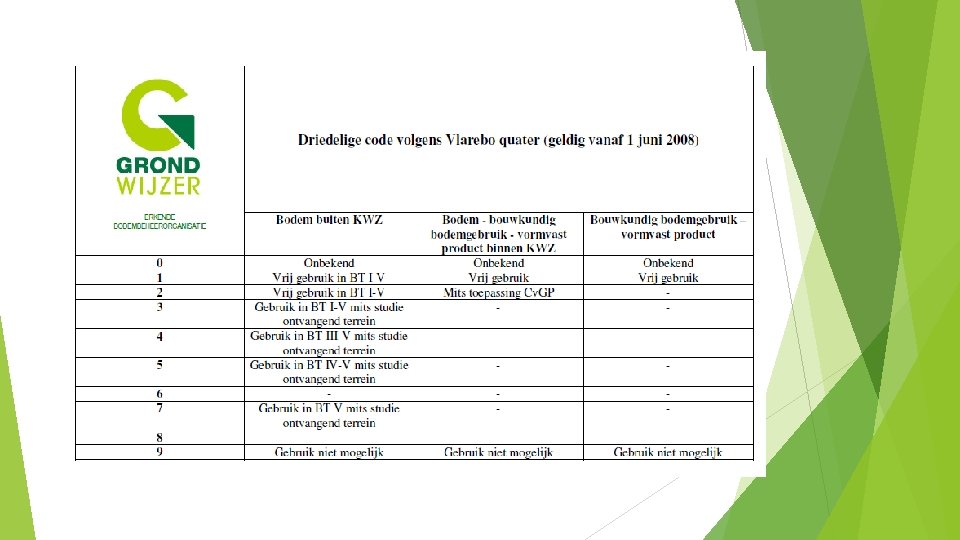 Krachtlijnen driedelige code : 2. x. x: vrij te gebruiken x. x. 1: te gebruiken in bouwkundige toepassingen x. 1. x: vrij te gebruiken binnen (deel) van de werf 999: af te voeren naar grondreinigingscentrum