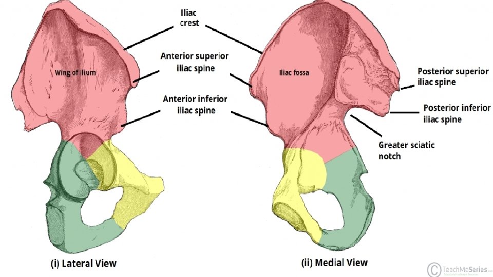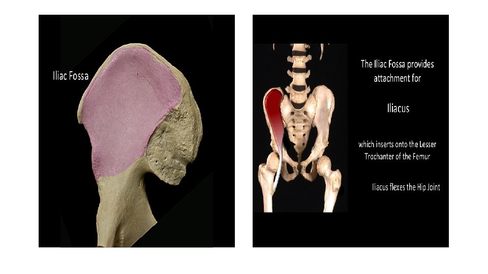 • Ilium • The ilium is the widest and largest of the three parts of the hip bone, and is located superiorly. The body of the ilium forms the superior part of the acetabulum (acetabular roof). Immediately above the acetabulum, the ilium expands to form the wing (or ala). • The wing of the ilium has two surfaces: • Inner surface – has a concave shape, which produces the iliac fossa (site of origin of the iliacus muscle). • External surface (gluteal surface) – has a convex shape and provides attachments to the gluteal muscles • The superior margin of the wing is thickened, forming the iliac crest. It extends from the anterior superior iliac spine (ASIS) to the posterior superior iliac spine (PSIS). • On the posterior aspect of the ilium there is an indentation known as the greater sciatic notch