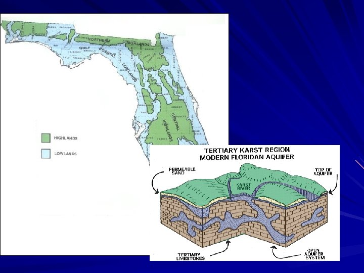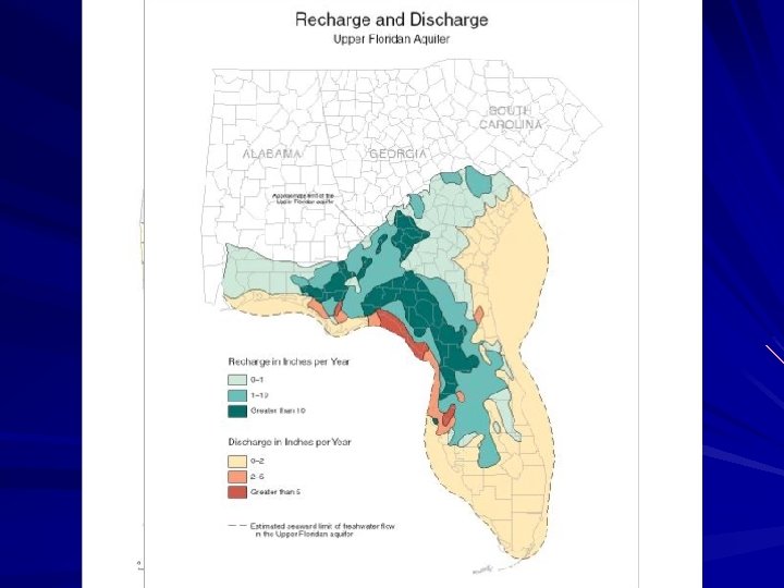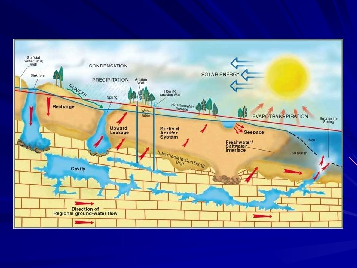 Aquifers/Groundwater 0. 6% of total earth water. 98% of all readily available freshwater Supplies ½ of the drinking water in U. S. and 90% of the drinking water in FL.