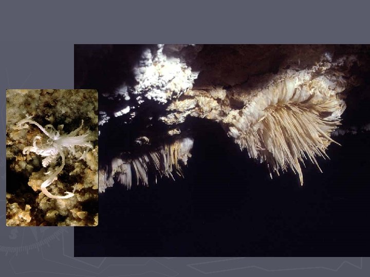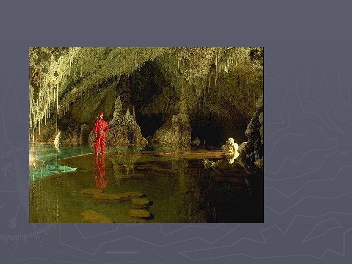 Groundwater Groundwater water that soaks into the ground Slides: 25 Download presentation Groundwater Groundwater ► water that soaks into the ground and collects in the pores of the rock underlying the soil (30. 1%)of all freshwater exists as groundwater Soil and rock are permeable if water can pass through the pore spaces ► example - sandstone Soil and rock are impermeable if water cannot pass through them. ► example - granite Aquifer – a layer of permeable rock that lets water move freely ► Zone of saturation – the area where all pores in the rock are filled with water ► Water table – upper surface of the zone of saturation Water Table ► Many people get their water from groundwater through wells ► Groundwater flows into a well, and a pump brings it to the surface ► Good wells extend deep into the zone of saturation, past the water table ► Wells can dry up during dry seasons or if demand is too high Artesian Wells – water rises to the surface under pressure Springs – the water table is so close to the surface that water flows out Geyser – a hot spring that erupts periodically, shooting water and steam into the air The work of groundwater ► Groundwater mixes with carbon dioxide to form carbonic acid ► Acidic groundwater moves through cracks in limestone, dissolving the rock ► Gradually, the cracks in the rock enlarge until a cave is formed Stalactites ► calcium carbonate deposit that hangs from a cave’s ceiling Stalagmites ► Calcium carbonate deposit that forms on a cave’s floor If underground rock is dissolved near the surface, a sinkhole forms